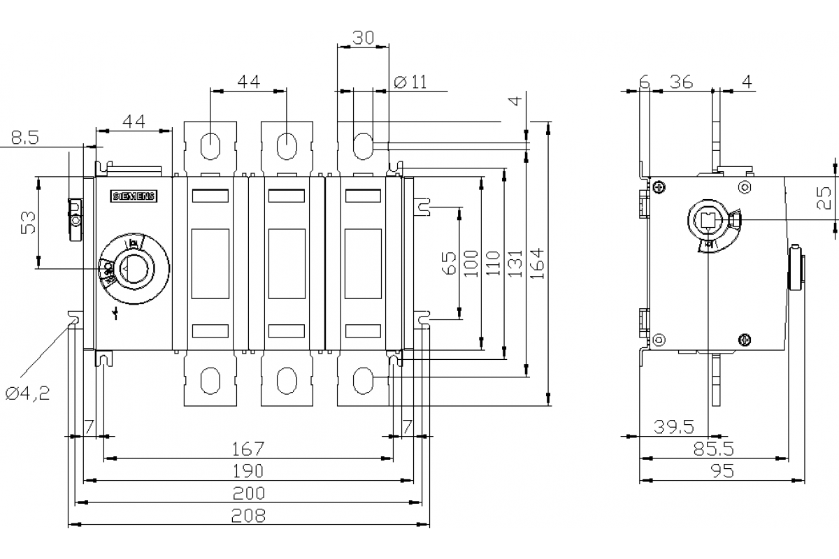 выключатель-разъединитель 500A, типоразм. 3 3-пол. боковой привод, левый базовое устройство без рукоятки плоский контакт