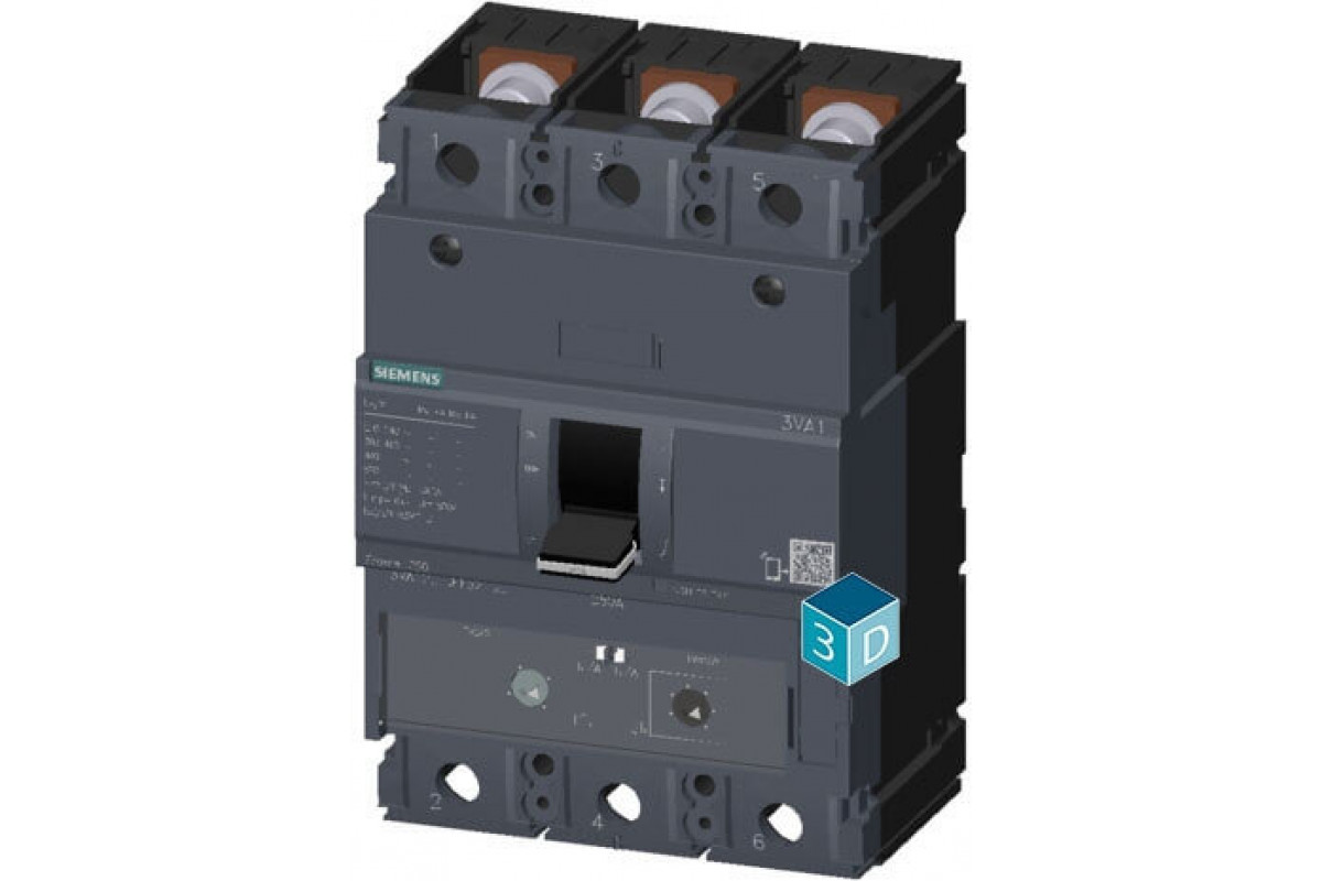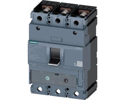 Выключатель в литом корпусе 3va1 iec типоразмер 250 класс откл. способности h icu=70ka @ 415 в 3-полюс., защита линии tm240, atam, in=250a защита от перегрузки ir=175a …250a защита от тока кз ii=5…10 x in шинное присоединение